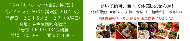昨年11月、ESDユネスコ世界会議では「あいち・なごや宣言」が採択されました。私たちアイシスジャパンNPOボランティアグループは「あいち・なごや宣言」を受けて、未来の子どもたちが安心して暮らせる環境を実現するため、持続可能な未来のためのライフスタイル改革を提唱しています。今回の講演会もその活動の一環として企画しました。.
